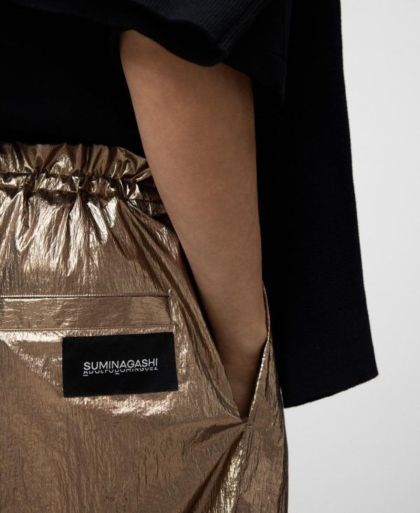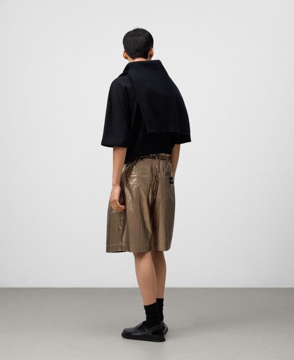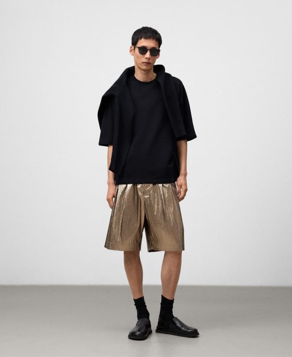 Bermuda relaxed fit hombre. Tejido metalizado arrugado. Cierre botón y cremallera. Cinturilla elástica. Trabillas. Doble pinza en delantero. Bolsillos laterales. Bolsillos de vivo en espalda. Etiqueta exterior logotipada en espalda.