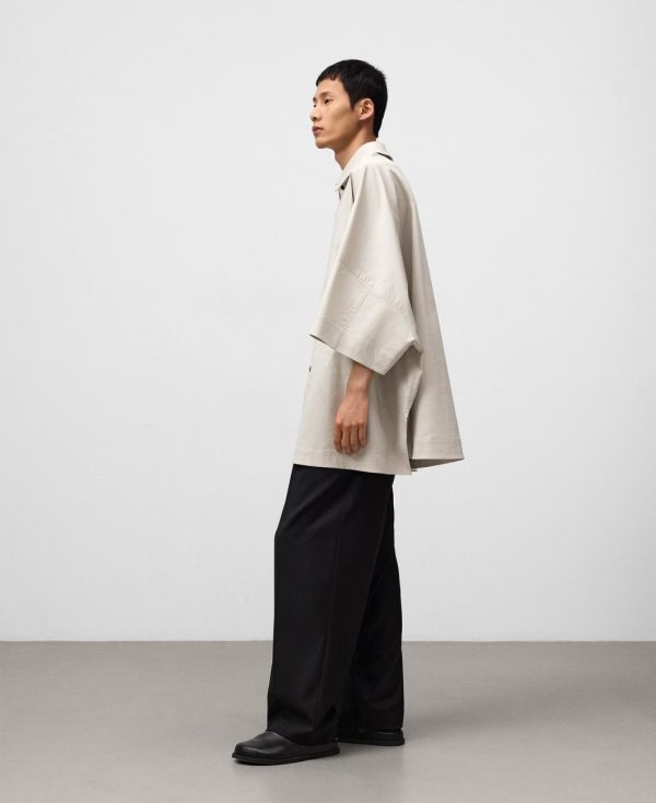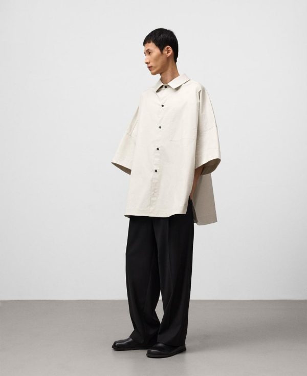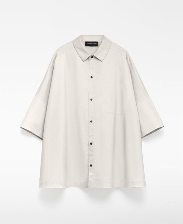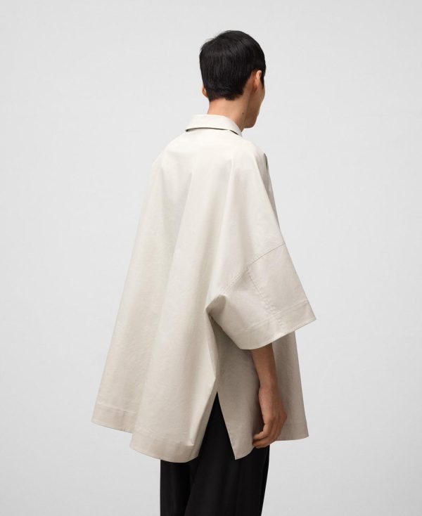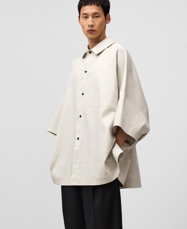 Camisa oversize algodón gris hombre. Cuello solapa. Costura de hombro adelantada. Manga japonesa. Botonadura frontal. Bolsillo en pecho con acceso interior.