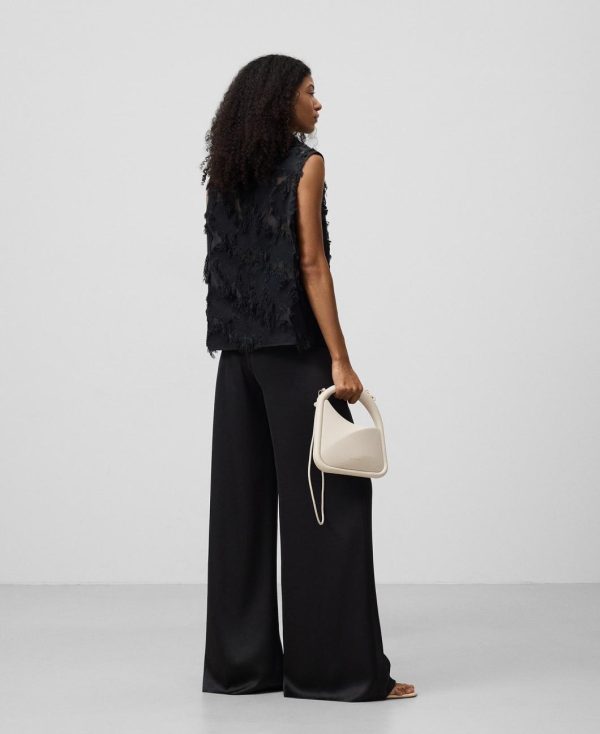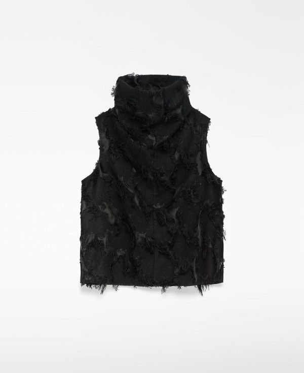 Top mujer. Manga sisa. Cuello chimenea. Tejido con transparencias y flecos.